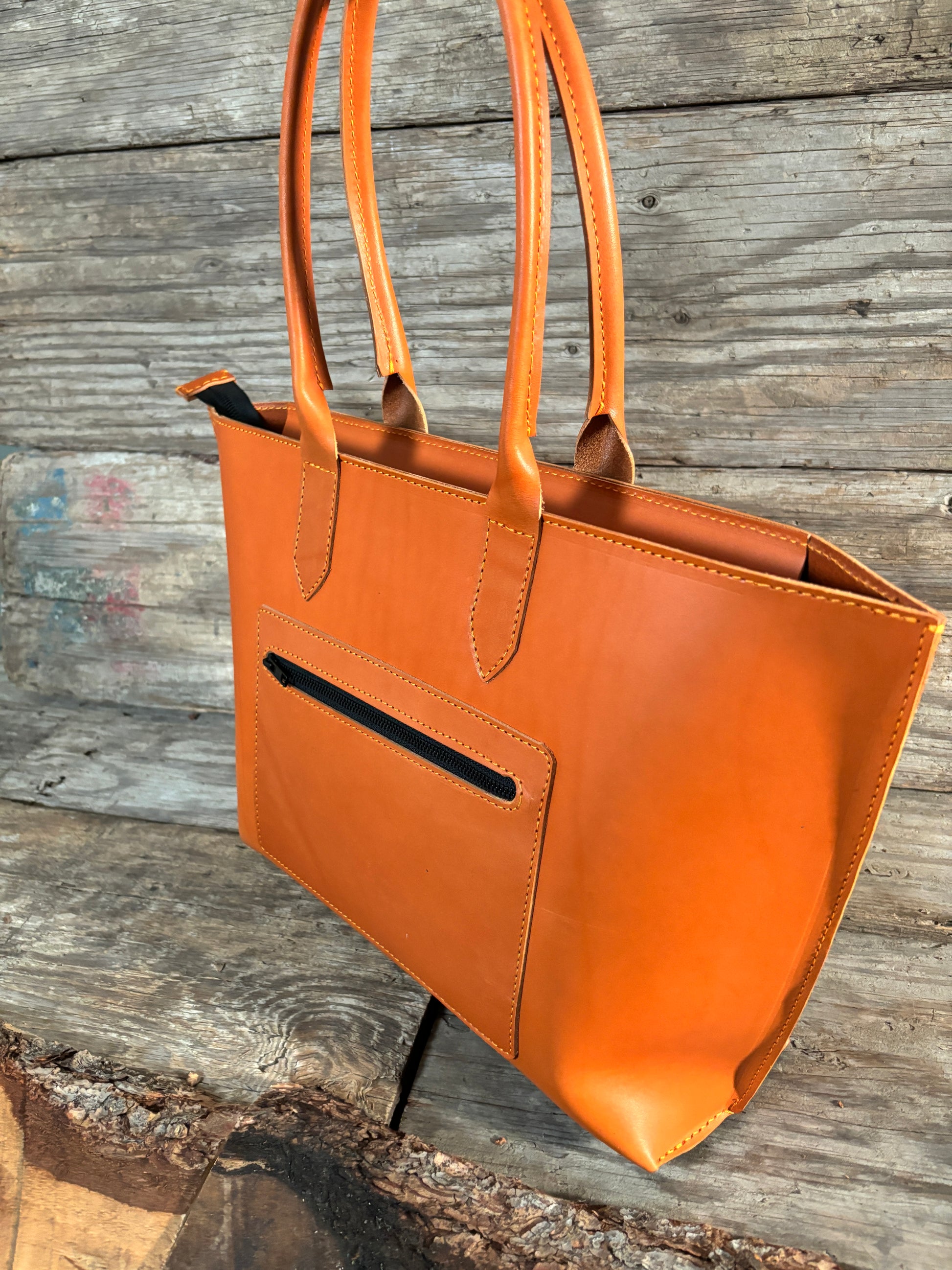 Measuring 19"x5"x13.5" this is the Leather Tote Bag you can use every day. Dress up for a night on the town, head to work or pick up some groceries. Zipper pocket on front of bag for security. Zip top closure. Crafted from premium full grain leather and meticulously stitched and assembled the feel and look of these bags just get better. Custom colour leathers and threads available. This hand bag is Crafted in Calgary Alberta.