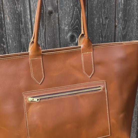 Measuring 19"x5"x13.5" this is the Leather Tote Bag you can use every day. Dress up for a night on the town, head to work or pick up some groceries. Zipper pocket on front of bag for security. Zip top closure. Crafted from premium full grain leather and meticulously stitched and assembled the feel and look of these bags just get better. Custom colour leathers and threads available. This hand bag is Crafted in Calgary Alberta.