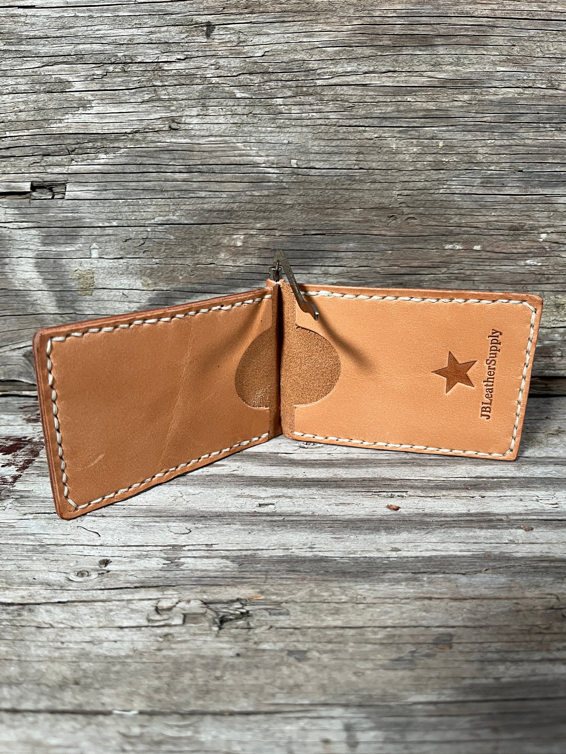 A slim and discrete wallet that holds credit and business sized cards with spring loaded money clip. One outer pocket and two on the inside. Perfect for a suit or front shirt pocket. All wallets require a break in period as this leather is new and awesome! Be patient and it will reward you. 4.5"x2.75"