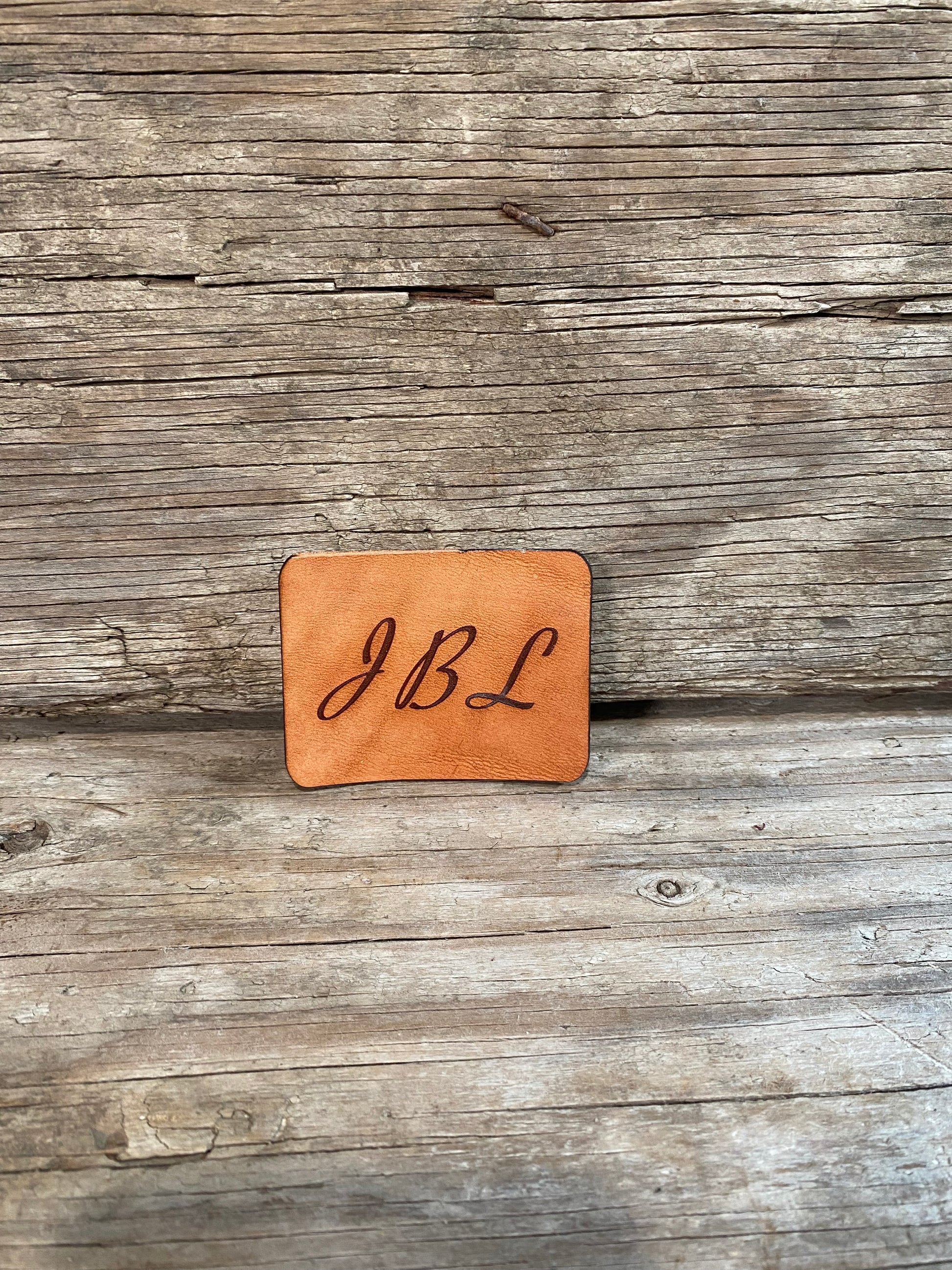 Etching achieved by laser engraving on leather. Will produce a black or burned look like in pictures.